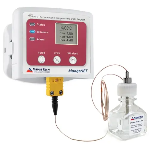 Madgetech ofrece equipos de registro de datos inalámbricos de sensor externo con la opción de usar una botella de Glicol para simular las condiciones de la carga y evitar falsas alarmas por los cambios repentinos de temperatura en la cámara generados por la apertura. En particular, el VTMS -Sistema de Monitoreo de Temperatura de Vacunas- viene equipado con un termopar Tipo K y amortiguación térmica (Glicol) con diferentes inercias térmicas.